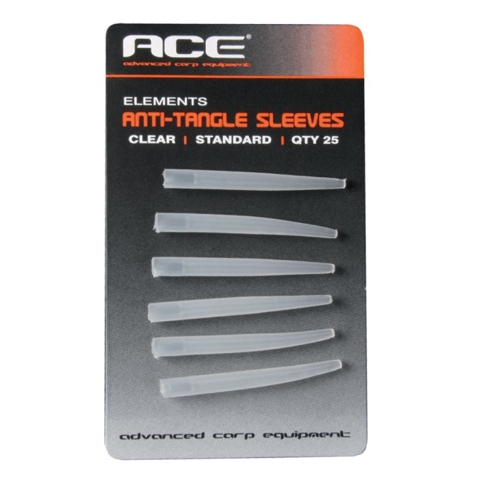 Ace Anti Tangle Sleeves, Created for use with ACE QC swivels to slide back and protect the hook after the hooklink has been attached, these anti-tangle sleeves serve another purpose by not only protecting the knot which is vulnerable, especially when using in-line leads, but also help prevent tangles caused by the hooklink folding back during the cast. Supplied in standard size which are ideal for use with safety lead clips, or mini size which are perfect for use with helicopter rig set ups. Available in Silt, Gravel and Weed colours, and Clear.