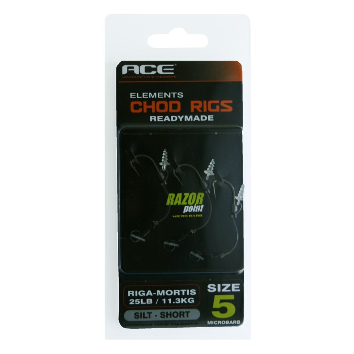 Ace Chod Rigs, These exceptional ready-tied chod rigs utilise top-of-the-range components which have been selected and designed by Terry Hearn. With three rigs in each pack, and five hook sizes to choose from, and in either long or short lengths you can be sure to find the perfect style to match your bait size and the venue youre tackling. These are available in barbed only, in sizes 4, 5, 6, 7 and 8, and in either long or short versions. Technical Info: Tied using the stick-sharp ACE Razorpoint SRC hooks for unrivalled penetration & power. Uses the Snell knot an ultra-neat, strong and reliable knot as used by Terry Hearn. The hooklink is ACE Rigormortis (silt) which has a high memory that ensures the hooklink curves at all times, creating the perfect presentation and camouflage. Rather than using a ring, they incorporate ACE Pop-Up Pegs that easily screw firmly into your pop-up boilie, making baiting the rig hassle-free. The top-quality size 11 flexi-ring swivel has a dull finish to prevent spooking the carp.