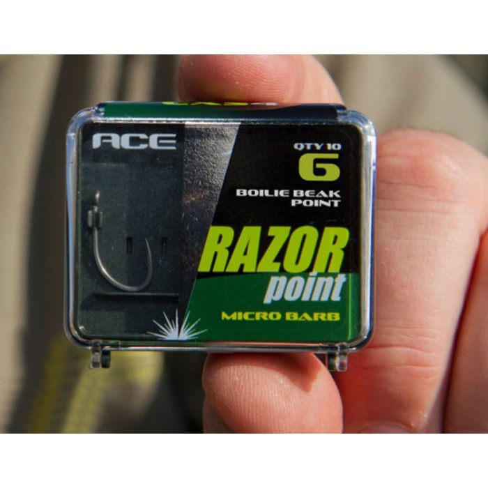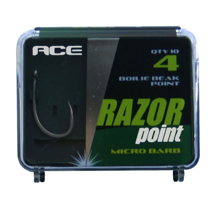 Ace Razor Point Boilie Beak Point Hook, ACE Carp Razorpoint Boilie Beak Point BBP carp hooks have been created by Terry Hearn to suit a huge array of applications, and for presenting bottom or pop-up boilies, or snowman rigs. The inwardly curved Beak Point is the best style to use when your rig may potentially rest on gravel when the rig is retrieved there is far less chance of the hook point becoming damaged by stones. Its a short shank hook having a straight eye and forged shank. Available in micro barbed in sizes 1, 2, 4, 5, 6, 7, 8 and 10, and in barbless sizes 6, 8 and 10. ACE Razor Point Hook Range: The ACE Razorpoint range of carp fishing hooks has been designed from scratch specifically to create the perfect hook pattern for the optimum rig and situation you are facing. Unlike many carp fishing hooks that are simply repackaged examples from hook manufacturers, these carp hooks have been created using experience and vast knowledge from our team of consultants: Terry Hearn, Iain Macmillan and Max Cottis, and many more. Refined to minute details to ensure perfect performance with every cast, ACE and our team of hardened carp angling experts truly believes our range of carp hooks is the most advanced on the market something we are extremely proud of. Technical Info: Dura-Point Technology - Produces one of the sharpest and longest points in the carp hook world, even after multiple uses. Japanese Carbon Steel The highest quality steel available for producing carp hooks, providing strength, durability and reliability. Non-Glare PTFE Finish Special coating ensures each hook blends-in with the venue bottom therefore minimising spooking of fish. Closed Eye Careful attention to detail means each hook eye is perfectly created so no damage will occur to your hooklink. Micro Barb Tiny barbs ensure minimum damage upon entry coupled with an extraordinary hook hold during the fight.