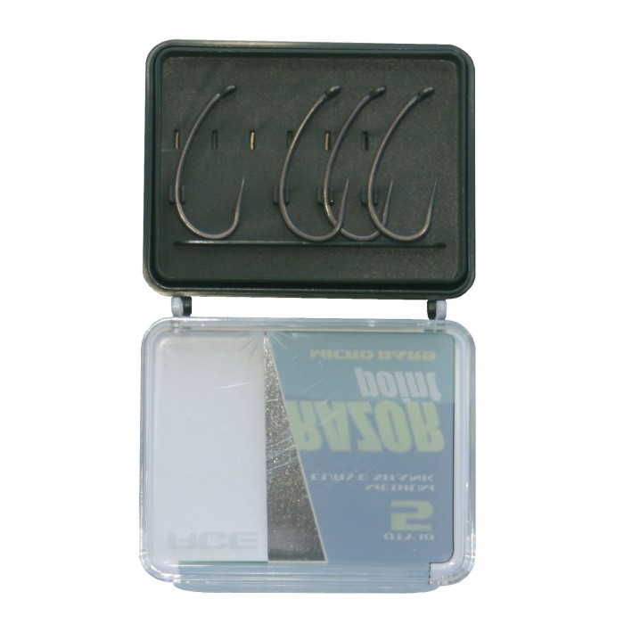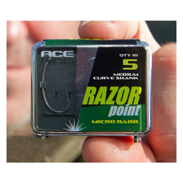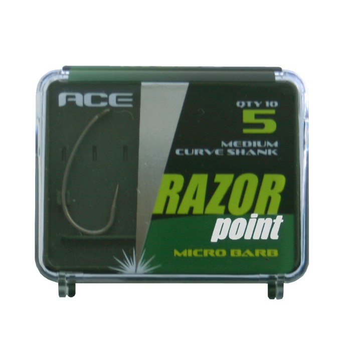 Ace Razor Point Medium Curve Shank Hooks, The ACE Razorpoint Medium Curve Shank carp hooks are unlike any other on the market, but thats not to say they arent proven in the field. Designed over two years, these hooks combine short and long shank curved styles, and a slightly downturned eye, to ensure the hook turns the instant the hook link is tightened. This provides an instant hook hold and coupled with the long and ultra-sharp point, instant penetration too. Its suitable for a wide range of presentations, including the popular 360 degree rig. This pattern is available in micro barbed, in sizes 1, 2, 4, 5, 6, 7, 8 and 10. ACE Razor Point Hook Range: The ACE Razorpoint range of carp fishing hooks has been designed from scratch specifically to create the perfect hook pattern for the optimum rig and situation you are facing. Unlike many carp fishing hooks that are simply repackaged examples from hook manufacturers, these carp hooks have been created using experience and vast knowledge from our team of consultants: Terry Hearn, Iain Macmillan and Max Cottis, and many more. Refined to minute details to ensure perfect performance with every cast, ACE and our team of hardened carp angling experts truly believes our range of carp hooks is the most advanced on the market something we are extremely proud of. Technical Info: Dura-Point Technology - Produces one of the sharpest and longest points in the carp hook world, even after multiple uses. Japanese Carbon Steel The highest quality steel available for producing carp hooks, providing strength, durability and reliability. Non-Glare PTFE Finish Special coating ensures each hook blends-in with the venue bottom therefore minimising spooking of fish. Closed Eye Careful attention to detail means each hook eye is perfectly created so no damage will occur to your hooklink. Micro Barb Tiny barbs ensure minimum damage upon entry coupled with an extraordinary hook hold during the fight.