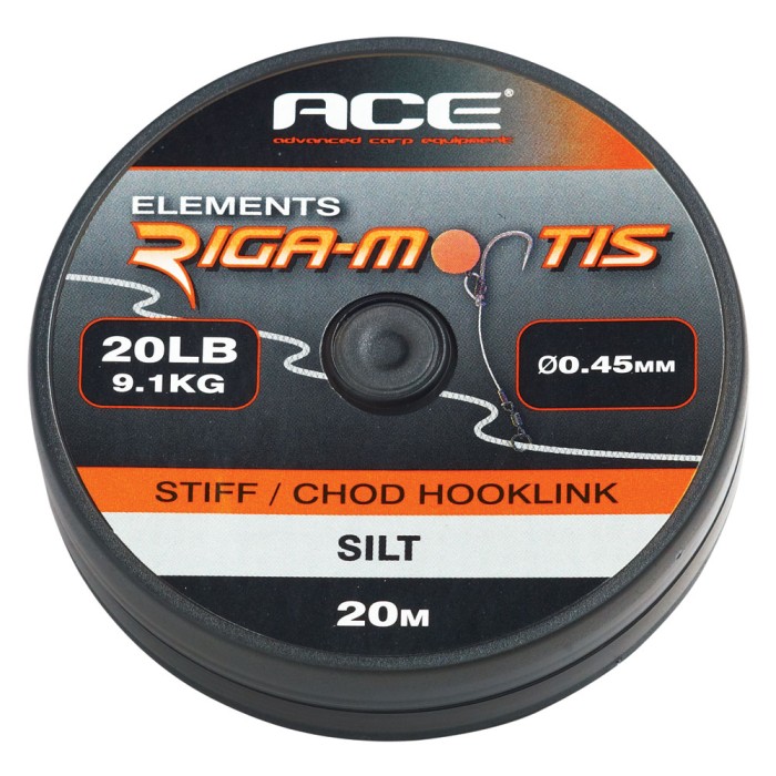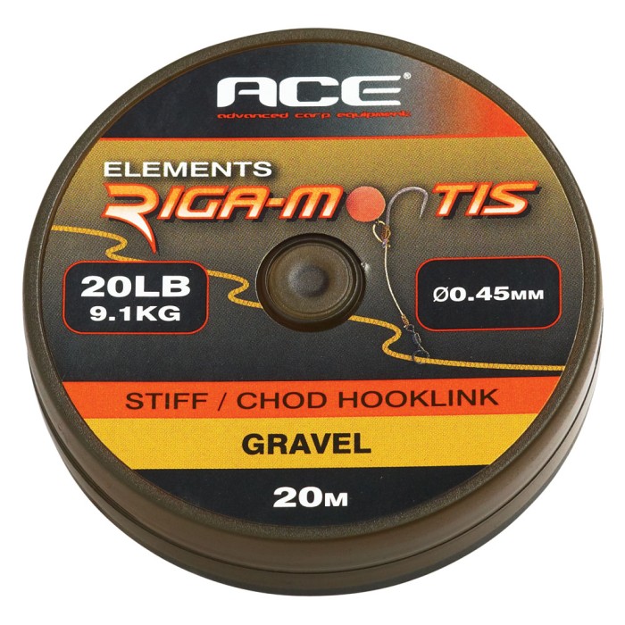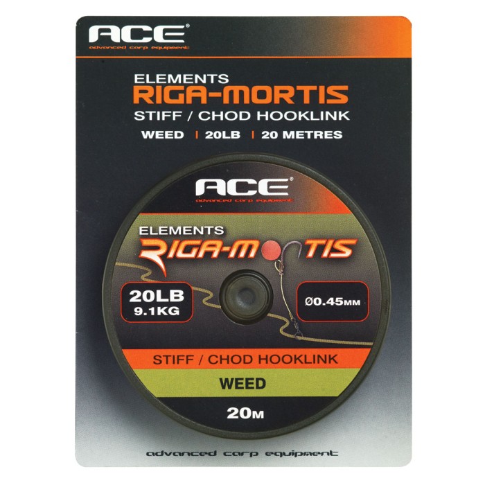 Ace Riga Mortis Stiff Chod Hooklink, This ACE RIGA-MORTIS Hooklink Line can be easily curved between your fingers and has an extremely high memory so the shape of your 'Choddies' is maintained during the cast. Available in different colours to blend into different lakebeds, the line can be straightened again by stretching it out hard for a few seconds.