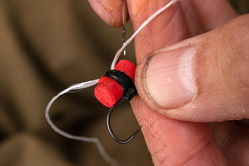 Select your zig rig and thread a short piece of bait floss under the zig rigger with your needle.