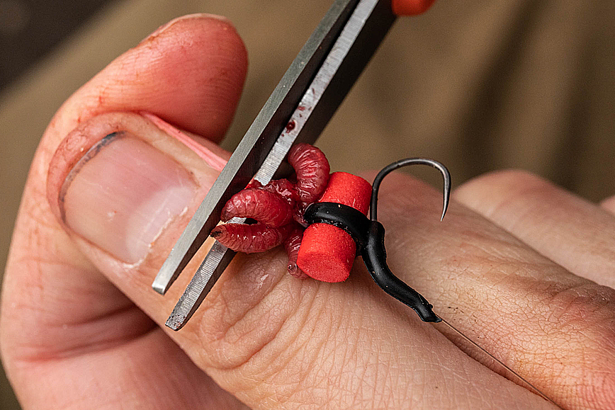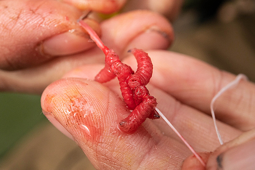 Secure the maggots in place with two simple over hand knots, then trim off the floss tags with your scissors.