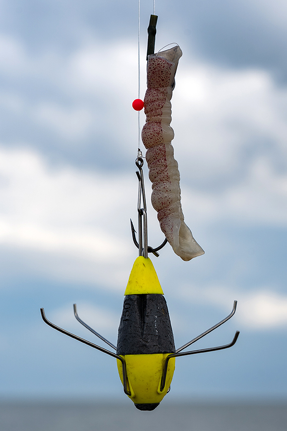 Thread the bottom hook of your pennel rig through the squid as shown.