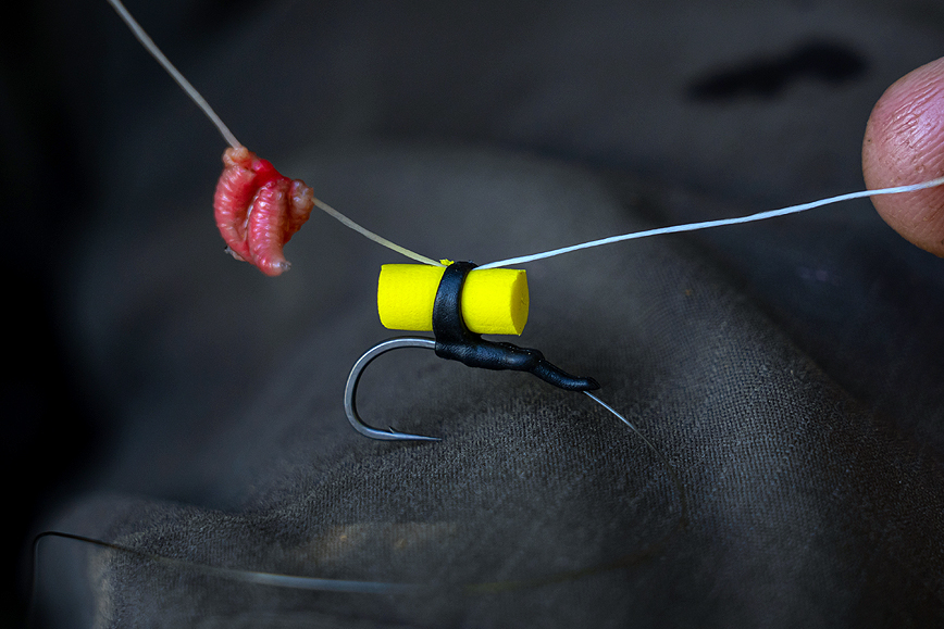 Thread 3-4 maggots onto the bait floss.