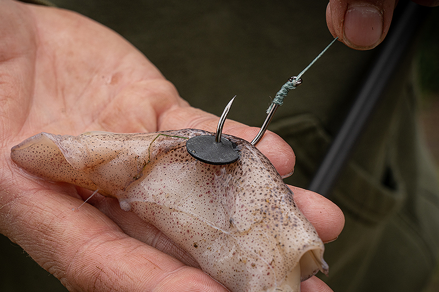 Attach your chosen bait such as squid, lobworms or fish baits to the hook and hold the bait in place with a bait shield.
