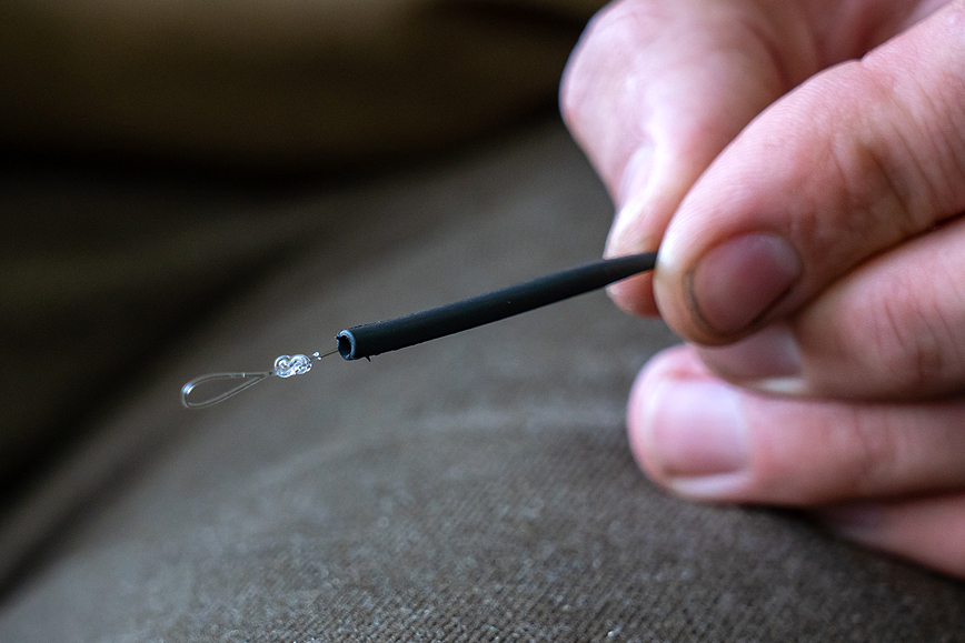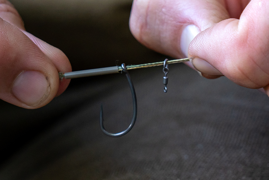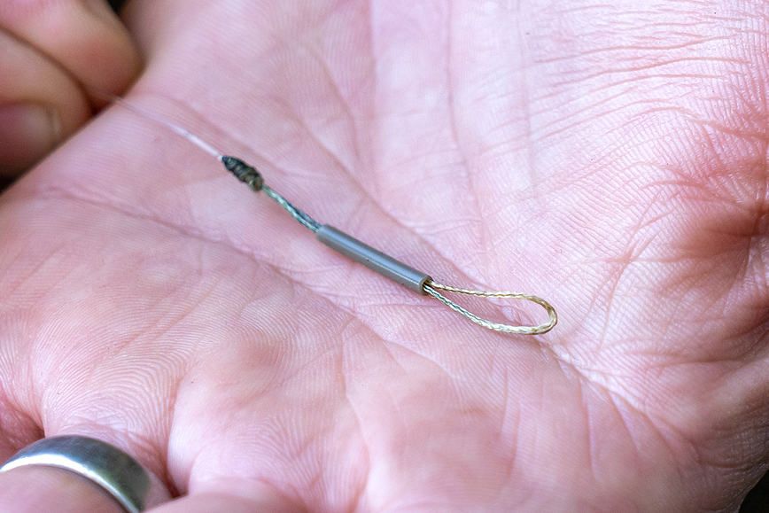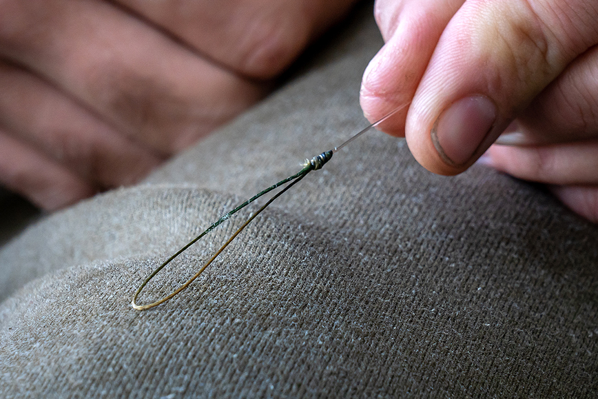 Slide an anti-tangle sleeve onto the fluorocarbon, then tie a figure of eight loops.
