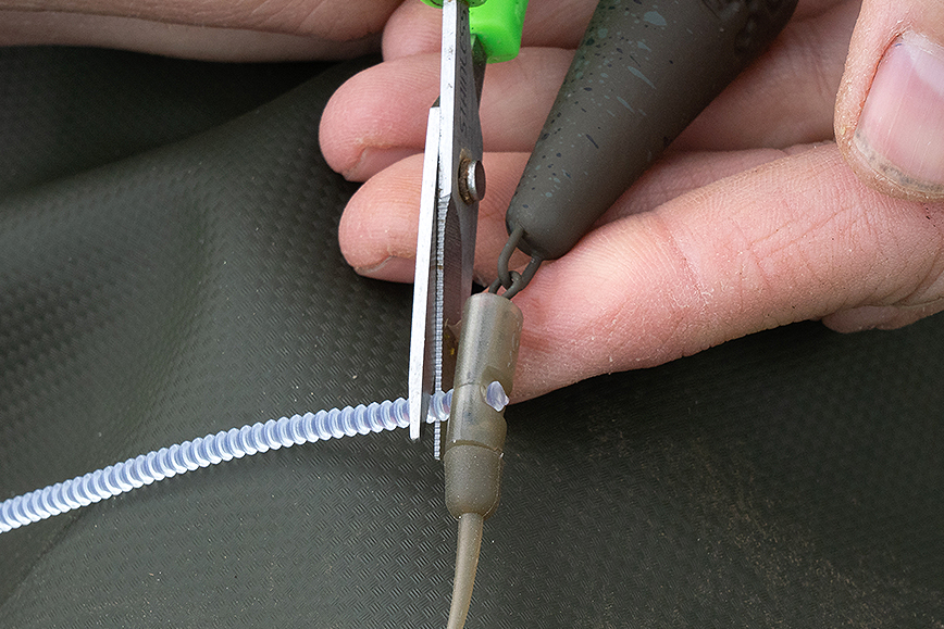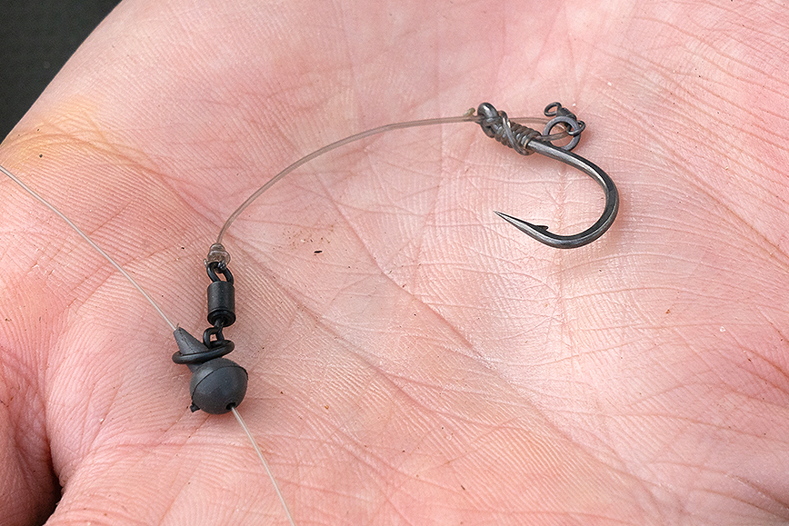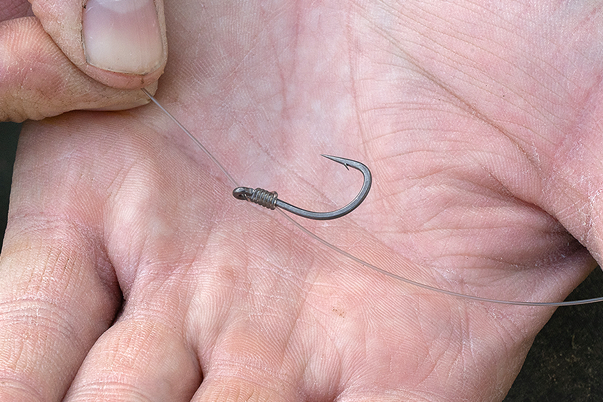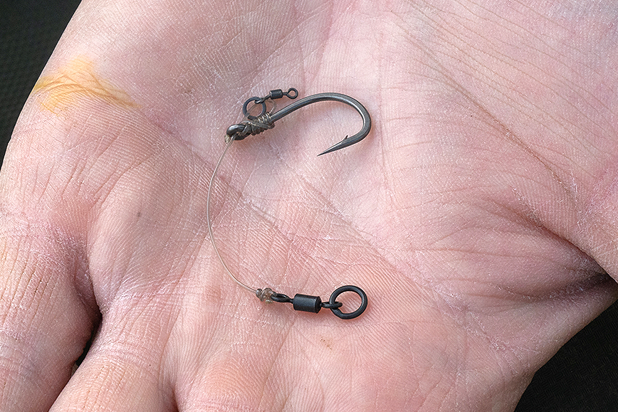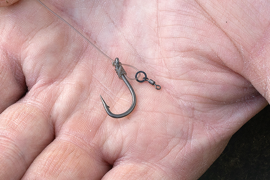 Attach a ring swivel to the chod at your required length using a two turn blood knot. Then using your thumb put a slight curve in the chod.