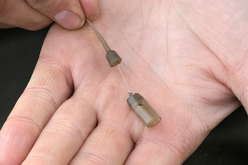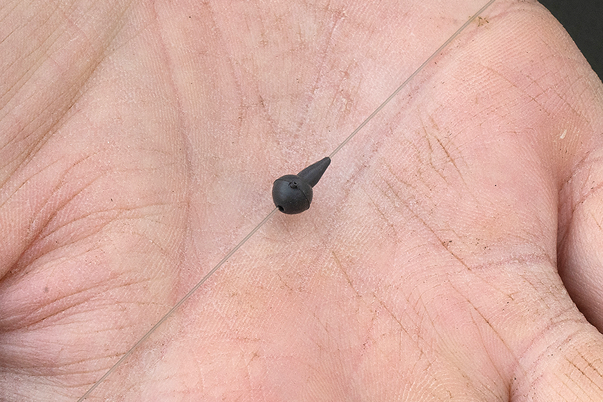 Slide a tungsten bead onto your mainline followed by a tungsten line stop. Make sure the bead is the correct way around so that the larger hole can sit on the line stop.