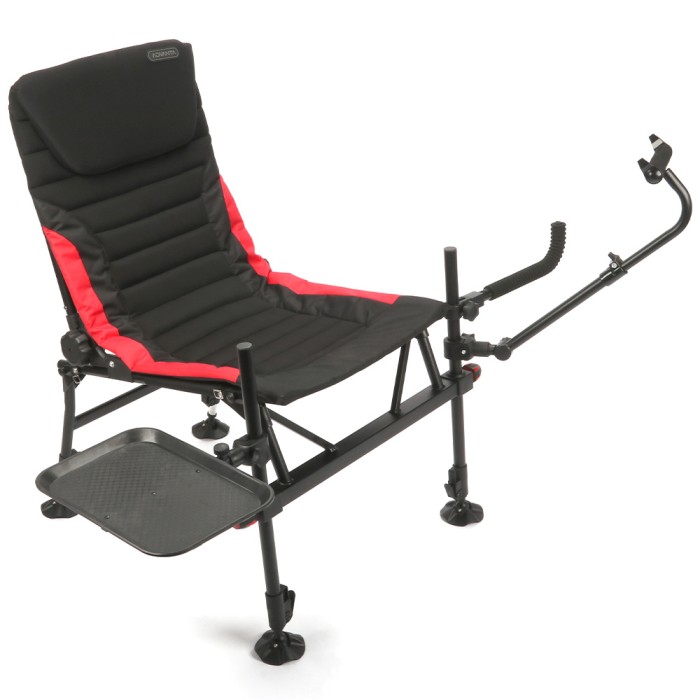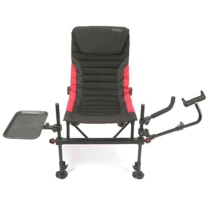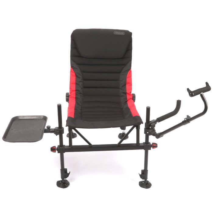 The Advanta feeder chair & Accessories offers the best of both worlds to Coarse and Match Anglerswho want to fish in comfort with support for their back and need all their accessories and tackle items close at hand. The Advanta feeder chair feature a hybrid design between a standard fishing chair and a seat box, using the front legs of a box and rear legs of a normal fishing chair. This has the advantage of allowing the front legs to be used in conjunction with all types of fishing accessories such as rod rest, support, and side trays. The Advanta feeder chair features a comfortable and well-padded mattress, this in conjunction with the angle adjust makes for an incredibly comfortable chair to sit in for extended periods while you fish.