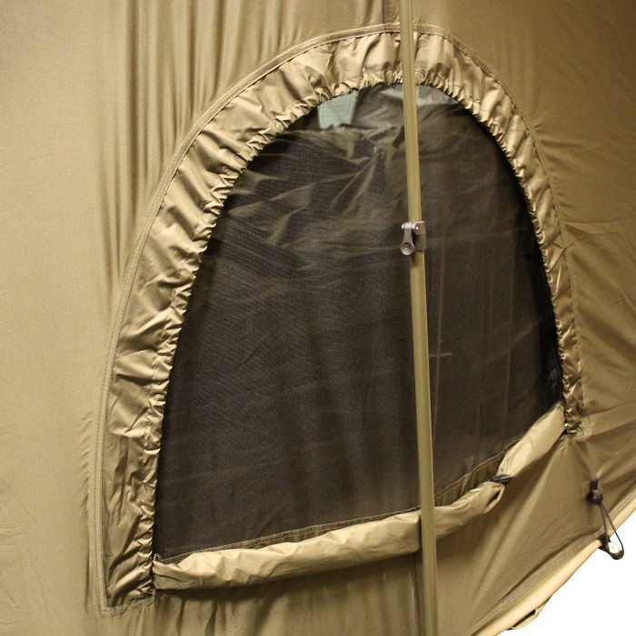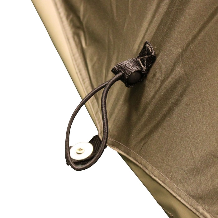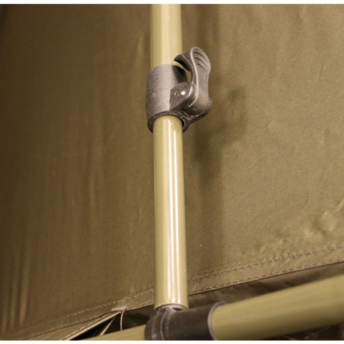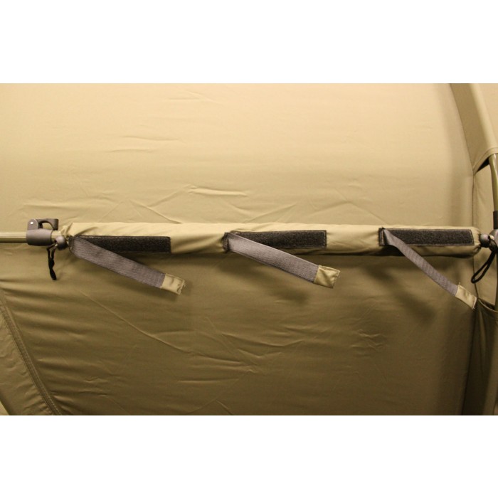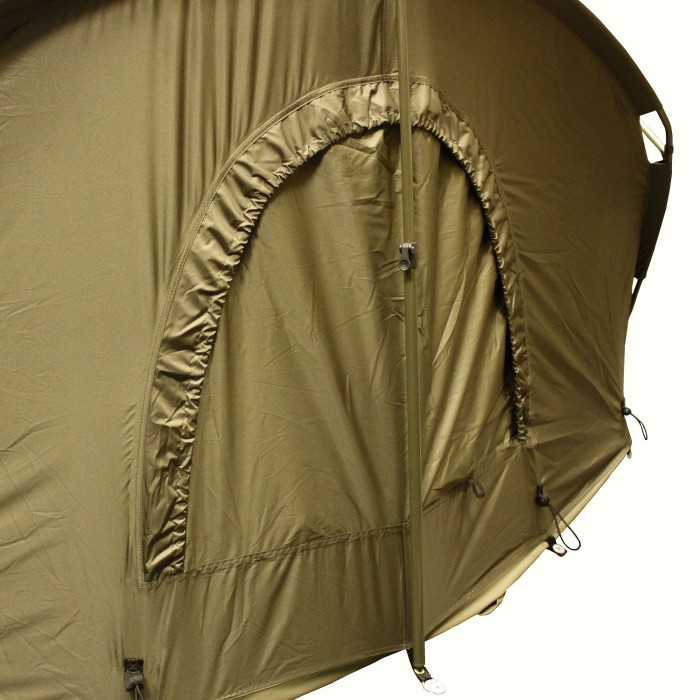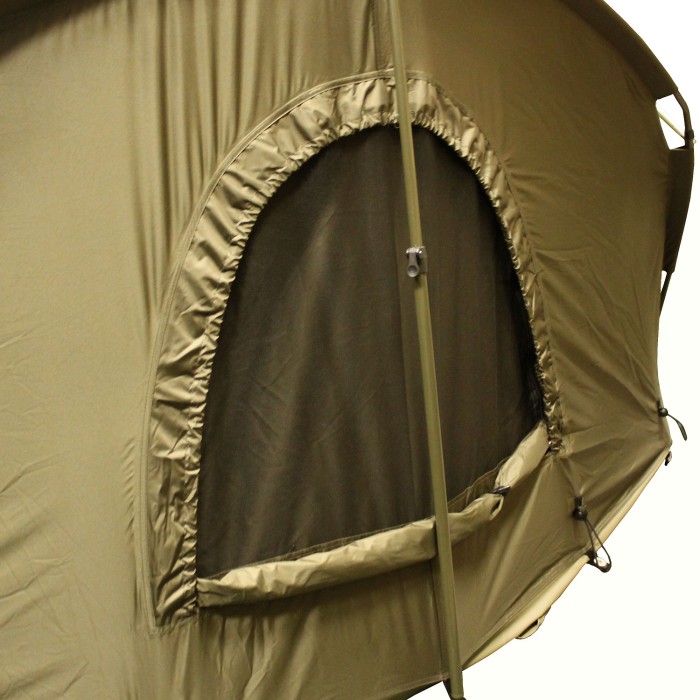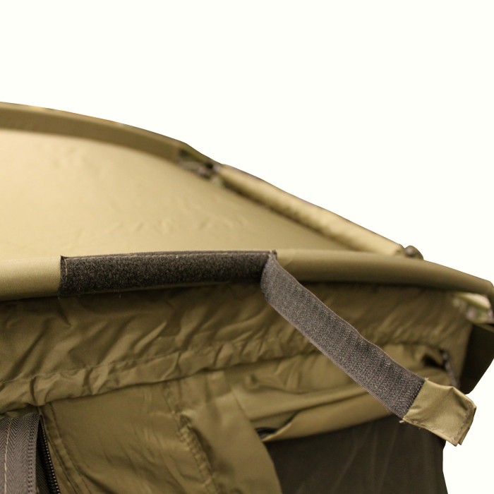 Featuring a roll up door and window covers which are fitted with one zip and one Velcro closure on each window. The bivvy also comes with a detachable lightweight groundsheet and heavy duty pegs. The 5 Velcro rod supports will help you set up your rods with ease.
