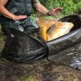 The sides of the cradle can be folded out to go on the floor and comfort your knees when kneeling to unhook and photograph the fish. This keeps your clothes clean and your knees safe from sharp debris which would be especially effective when wearing some shorts in the summer months. Another side flap to cover the main area of the cradle when the fish would lay. This makes a shelter for the fish during the short time you are having them out of the water. The cradle-like structure of the design means water will stay central with the fish offering a more comfortable experience for the fish. The fish is also laying on a thick foam base for cushioning.