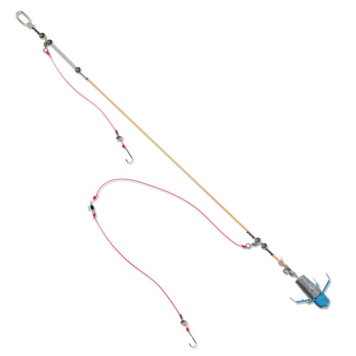A rig with one hook above and one hook below the lead. Clipped baits are positioned closer together when casting.