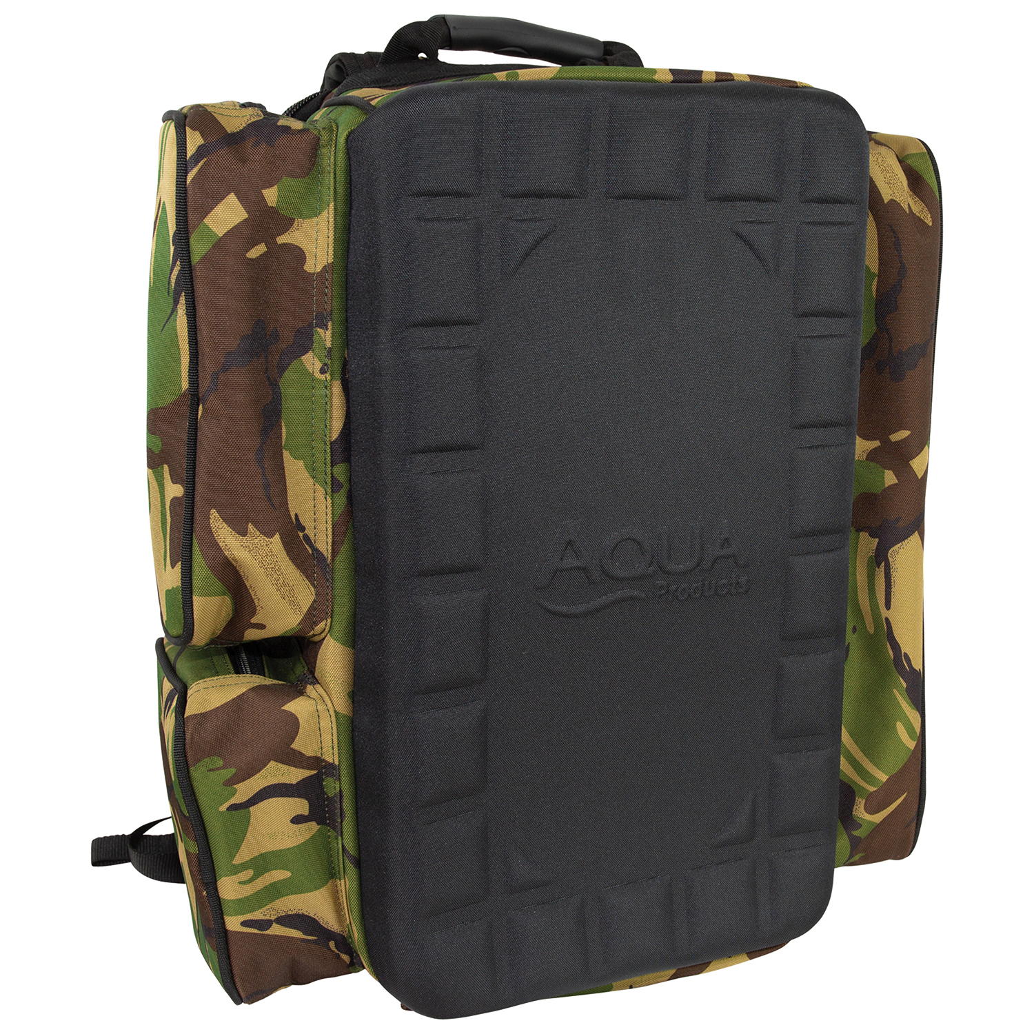 The Aqua DPM Roving Rucksack also boasts an adjustable, 3 point harness for secure, comfortable wearing. You can tension the waist to pull the fishing rucksack tight against your back and a heavily padded Neoprene lumbar support system ensures lower back comfort on long walks. A great design feature on this fishing rucksack are straps incorporated at the base to attach an Unhooking Mat or Aqua Atom Bivvy.  Aqua have made the base of this fishing rucksack with a moulded EVA base, ensuring its compatibility with a fishing barrow whilst maintaining protection against gravel and muddy banks. Ensuring that no water can get to your valuable fishing tackle from underneath the fishing rucksack. This carp fishing rucksack also features twin-direction heavy duty zips, which makes access quick and easy. This fishing rucksack also features additional neoprene grab handles for lifting. Finished off in the trademark Aqua DPM camo fishing luggage pattern, the Aqua DPM Roving Fishing Rucksack is a great addition to any carp anglers gear.