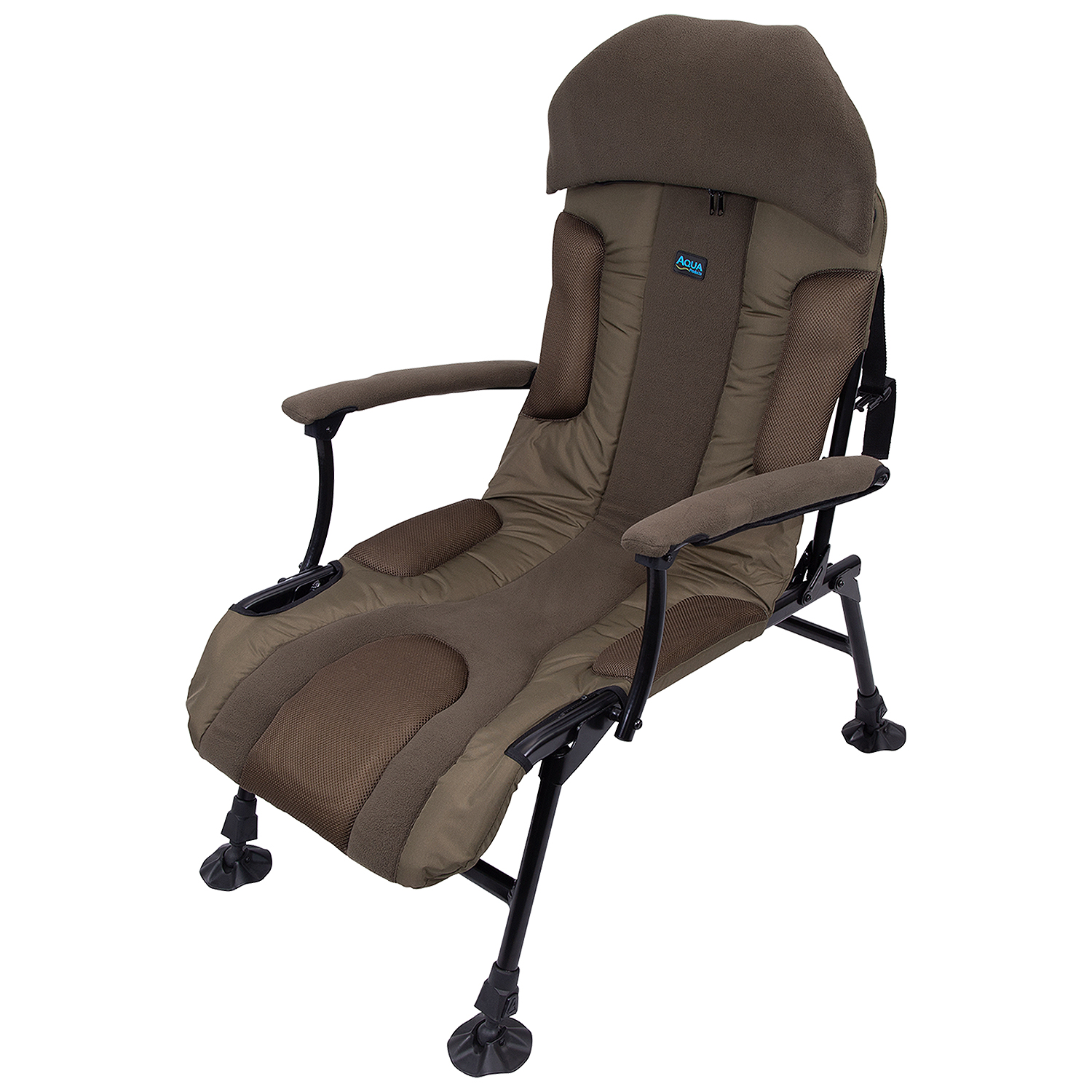 Ergonomically designed and super-lightweight, the Aqua Longback Fishing Chair really is the ultimate Carp Fishing session chair when it comes to comfort and support. The long back design, combined with the integrated fleece-covered armrests, gives a real element of luxury on the bank. This is ideal for the hours spent searching across the water for signs of fish while waiting for the rods to go. It features four fully adjustable one-touch legs with rotating mud, so this Aqua Chair can be placed at the optimum position to suit you, no matter what the terrain, and an adjustable headrest to allow you to really relax. The chair features a unique curved front drop-bar which further enhances prolonged comfort. At just 4.6kg, this Chair is extremely lightweight considering its size and features, which makes transportation a dream.