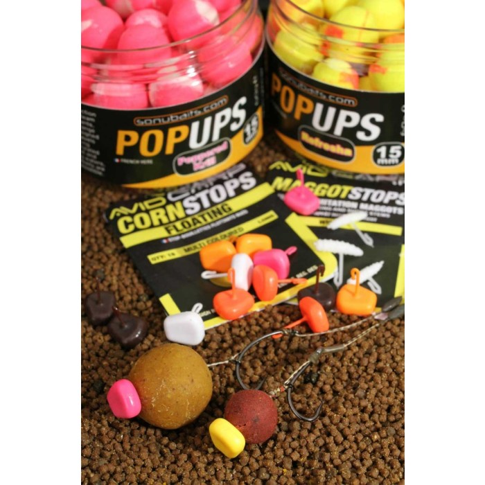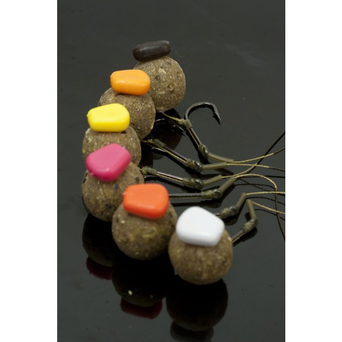 Corn-Stops will add a vibrant colour to almost any rig even Pop-Ups attracting more are more fish towards your hook bait. No more will you need to use a normal dumb bell hair stop these unique stops have a little plastic hook which when is looped on to a hair rig is easily pulled in to your bait leaving you with a fantastic hook bait arrangement.