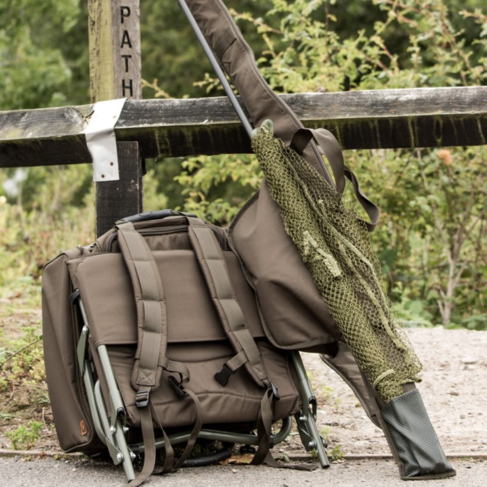 Stuff the ruckbag with a waterproof jacket, a couple of packs of bait, and your tackle box, add other tackle items, rod licence, and permits to the two large outer pockets, secure your unhooking mat to the two D-ring loops, and attach the chair, supplied as part of the kit, to the two attachment hooks – all packed up, and ready to go fishing.