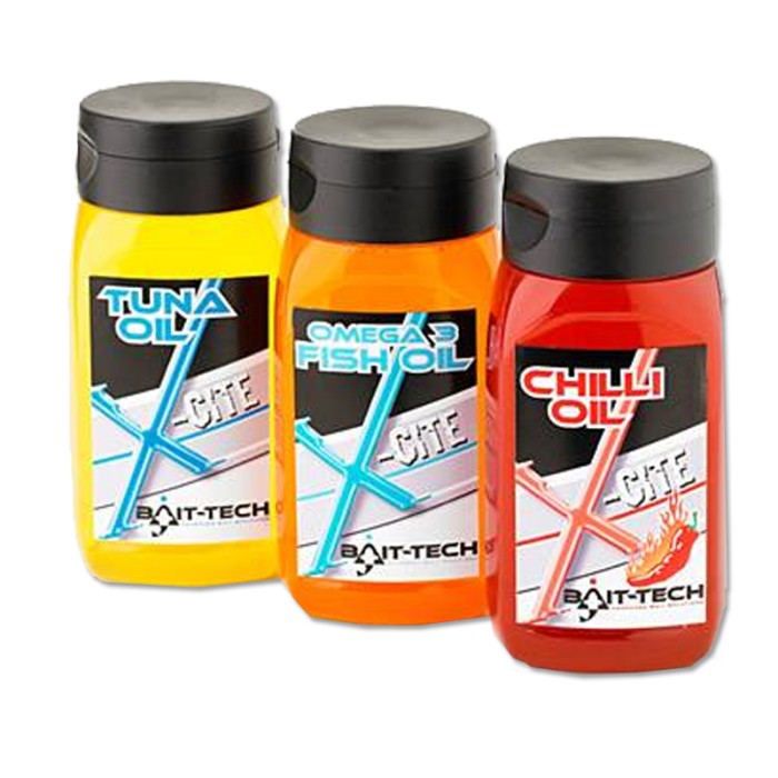 Many anglers choose to boost the attraction of their baits with liquid flavours and they simply don't come any better than our X-CITE range. A range of liquid attractants using the finest oils available. Listening to what our anglers want, we have produced three oils: Tuna Oil, Hot Chilli Oil and Omega 3 Fish Oil.