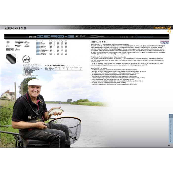 Sphere Zero-G F1+ A professional level pole for professional level anglers The Sphere Zero-G F1+ is the lightest and stiffest pole that has ever been bought to the market. Each Sphere pole is hand made from the highest quality Japanese carbon, with grades carefully selected to provide the optimal balance between pole weight, stiffness and strength. The pole is both stiffer and significantly lighter than typical flagship poles. This is an outstanding, professional level competition pole that has been designed for skilled pole anglers who want the very best, and have the experience to use its ultra high performance to give them a competitive advantage. We do not specify an elastic rating as this is no real measure of a poles strength. Used correctly the Sphere pole is adequately strong for all typical match fishing situations where a conventional top-end pole would be used. The Sphere Zero-G also introduces a number of innovations including - the Multikit, a new design of topkit that can be used as a 2.5m conventional kit, or as a 1.75m one piece kit, without loss of pole length - the SEPPs, a special versions of our unique Square Pole Protector sections which make fishing at long lengths and in windy conditions comfortable and stable. -Tactile Precision Points these are raised areas on the butt sections that can be felt when the pole shipping out. They allow accurate fishing without looking down for painted lines, and act as a stop by marking the end of the pole.