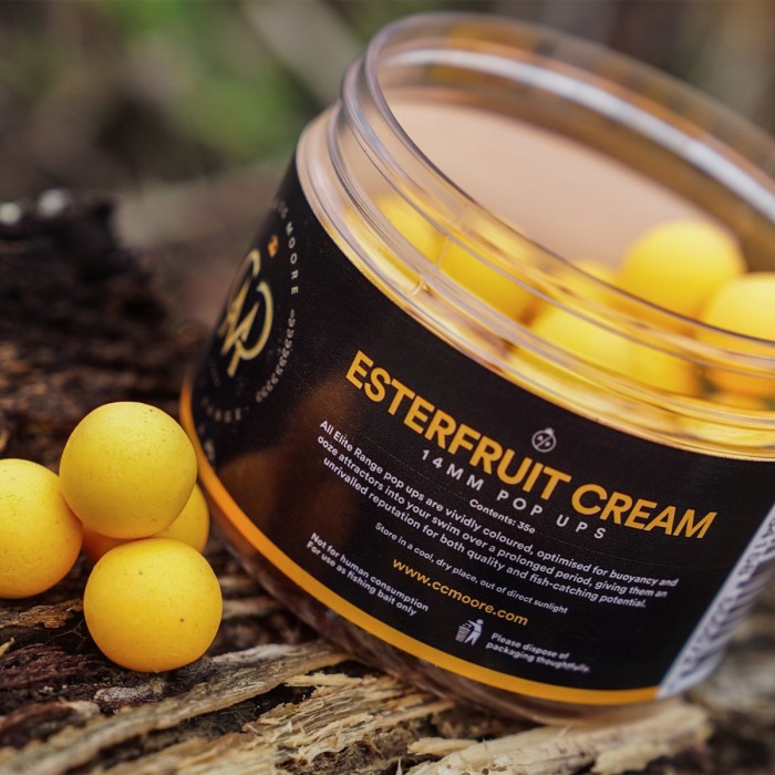 CC Moore’s Elite Range of Pop-Ups and Hookbait Boosters have been painstakingly developed by its bait technicians to supply big fish anglers with an intensely concentrated package of attraction in a specialist hookbait system. If you are a serious angler who will not settle for second best, the Esterfruit Cream pop-ups are the perfect choice for you. This high quality, hand rolled pop ups contain a unique, tried and tested blend of flavours and feeding triggers that deliver an intense attraction profile covering a range of chemoreceptors.