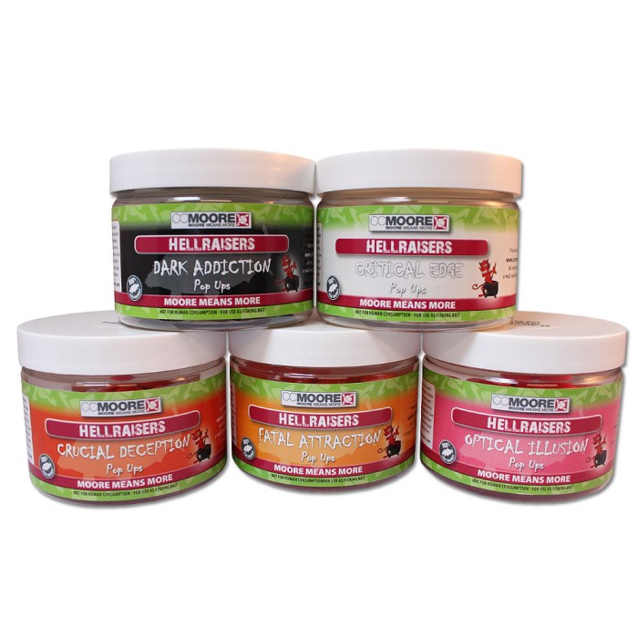 CC Moore Hellraiser Pop-Ups, These ultra-high attraction, high visibility hookbaits are extremely buoyant and have a unique, spongy physical structure which enables them to release powerful food signals and appetite stimulants far more easily than hardened/air-dried pop ups. With such a soft, pliable structure, Hellraisers can easily be mounted by piercing or tying them onto a hair, and can be trimmed with a knife or scissors to create a critically balanced bait of unusual shape. These exclusively produced pop up hookbaits are packed with flavours, esters, essential oils and other outstanding fish attractors to a point where no more can be added without damaging the buoyancy of the hookbait. Renowned fish stimulating products such as N-Butyric Acid, Betaine and our outstanding powdered palatants have also been added to the mix to create a new generation pop up which will get you a bite when standard hi-viz pop ups would fail. Containing unprecedented levels of rarely-used active flavour components in each new Hellraiser Pop Up, these phenomenal new hookbaits release an irresistible stream of concentrated feeding triggers in all conditions. During the testing period, anglers using them have been blown away by their impact on fish, stating that they have never seen such instant and positive responses from fish when presented with a hookbait.