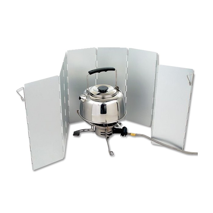 Lightweight foldable stove wind shield with built-in prongs to push into the ground for extra stability in strong winds. Chub Stove Wind Shield folds down to a very compact size.