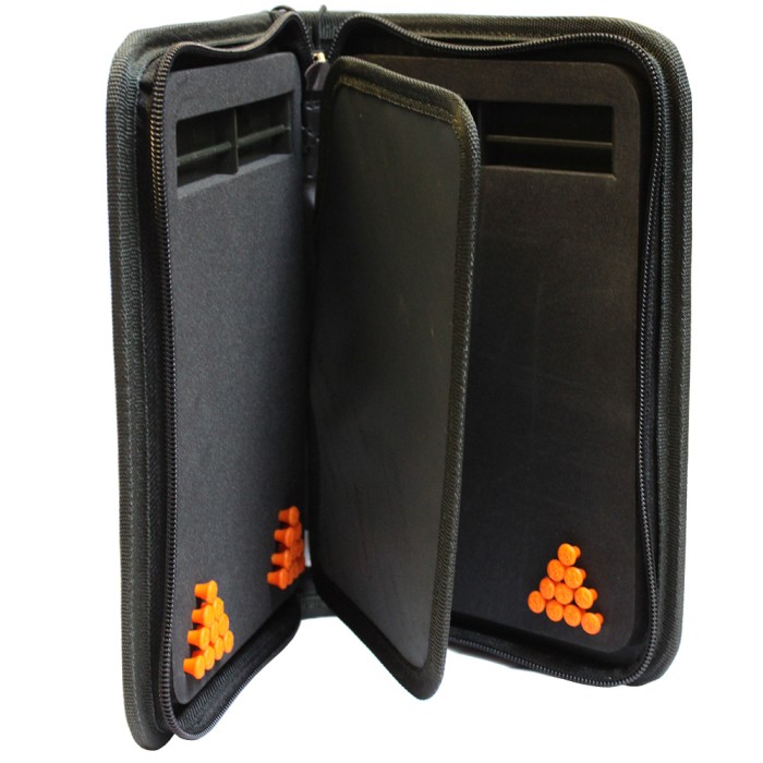 The Chub Compact Rig Wallet has a hard protective outer case to keep your rigs safe and secure. Although compact in size this double sided wallet has the capacity for over 40 rigs and is perfect for all short type rigs such as stiff and chod rigs. The integral moulded bar protects hook points from being damaged and the small easy-grab pins keep your rigs neat and tidy. A rigid divider also prevents tangles when the wallet is closed.