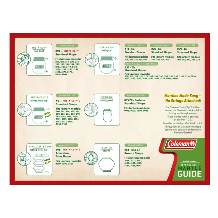 The Coleman Insta-Clip Tube Mantle, has convenient tabs that allow you to change mantles within seconds. It does not contain any asbestos or radioactive materials and comes in a pack of three mantles.