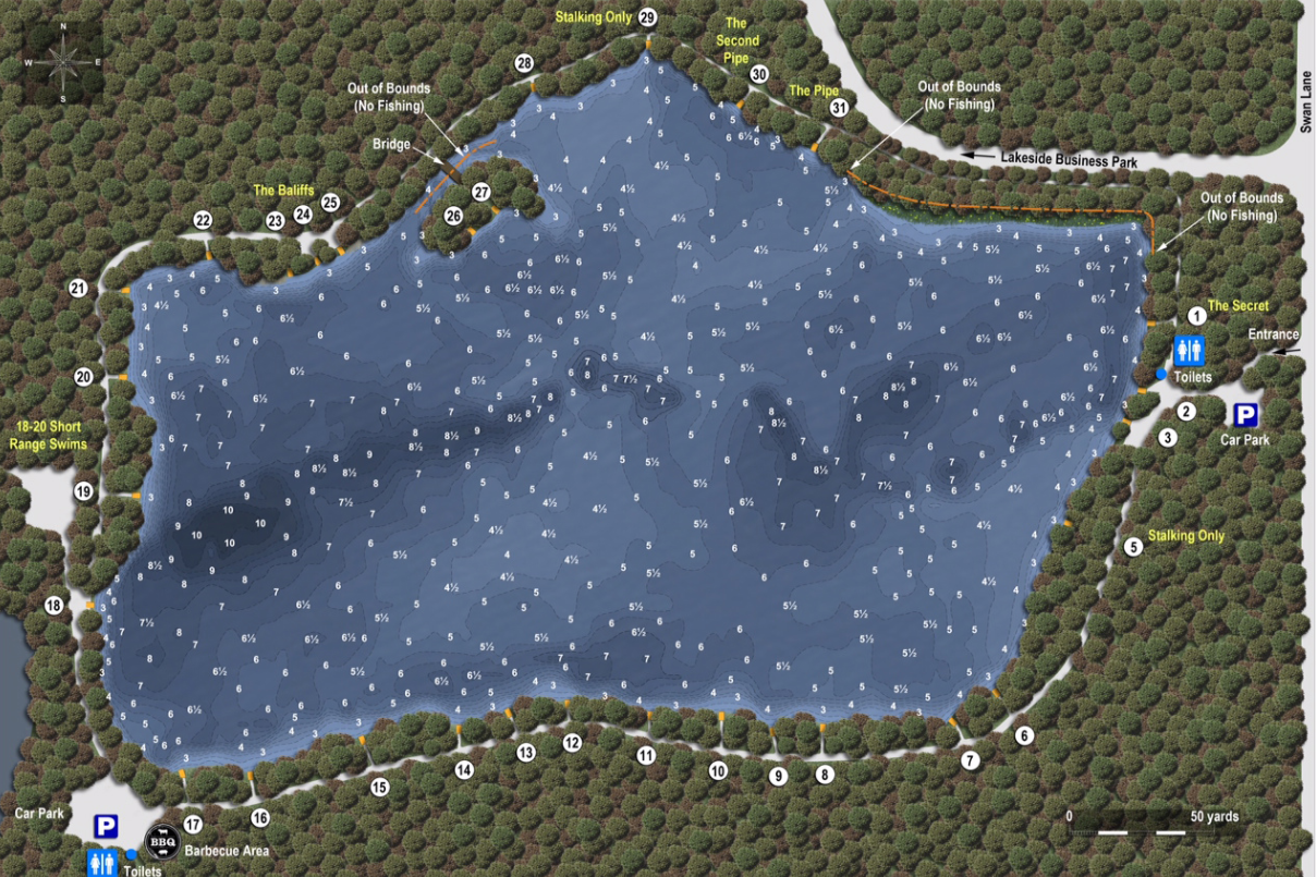 The lake is 14 acres in size and is relatively shallow with depths ranging from 2 to 10ft with an average depth of 5ft. There is one island from which fishing is permitted, and numerous gravel bars and features that can be easily located from a choice of 31 swims. Very few day ticket waters give you the chance of a 40lb + carp but the Sandhurst venue record currently stands at 45lb with at least 10 other fish breaking the magical 40lb barrier.