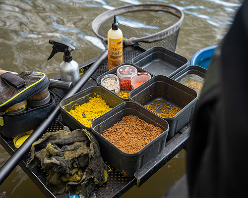 Fishing a method feeder may look simple, but if you have a quick look at my side tray you will see a range of bait tubs with different bait options. I like to give myself plenty of options, because sometimes the smallest differences can make a large difference in eeking out that match winning fish.