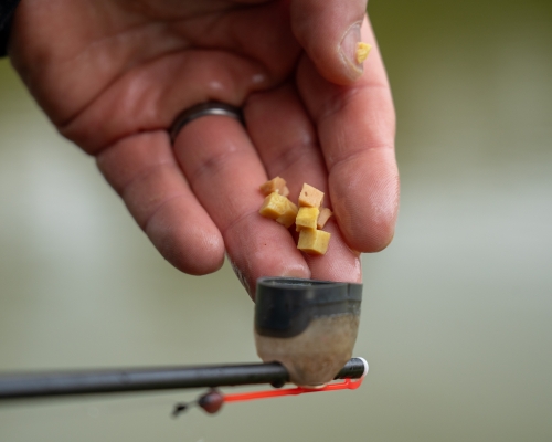 As fans of the series will know, I always like to do something slightly different with my bait to give myself an edge, rather than simply using it straight from the tin. For this session, I used a combination of two different types of meat: The Dynamite Baits Specimen tuff and the F1 Sweet. Both were cut into neat six millimetre cubes, giving a consistent feed and a range of hookbait options. Keeping the meat in a bit of lake water helps maintain its condition, especially in warmer weather, and wetting your hands regularly makes handling it much easier to handle the bait throughout the session.