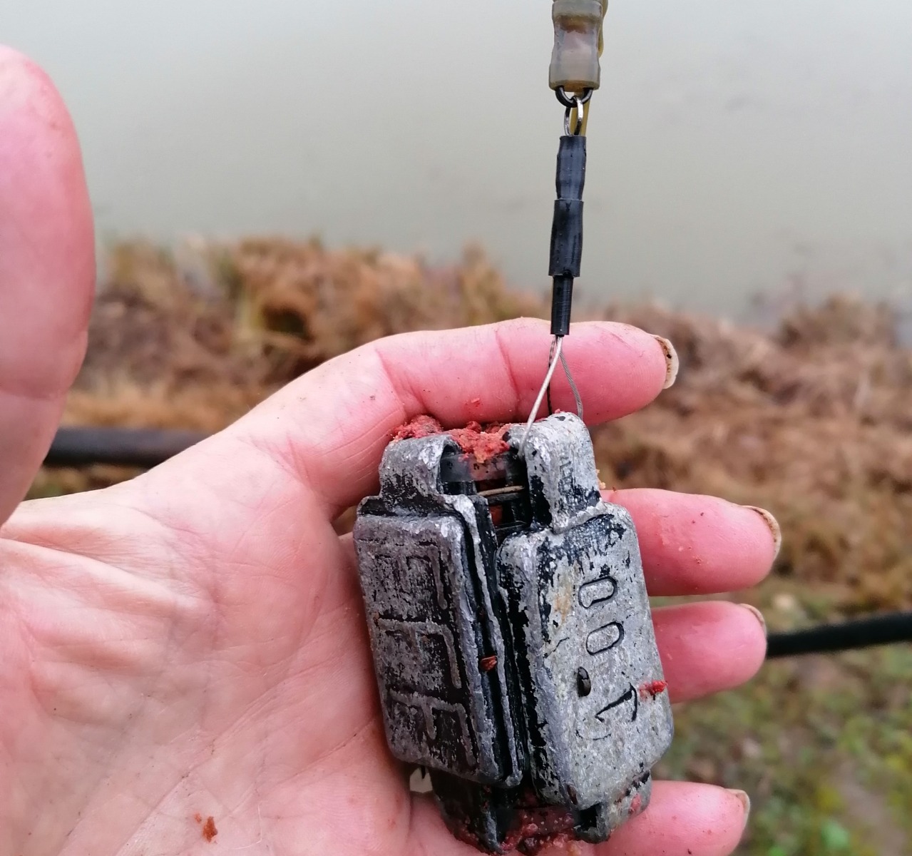 The weather continued mild but became very wet with lots of heavy but mild rain adding to an already swollen river, but like I have told you before this is perfect winter river fishing conditions. The extra flow was bringing with it loads of debris, including whole trees, and broken branches by the score, making fishing very tricky. At one point even my 6oz feeders weren’t enough so with nothing heavier available I cobbled a couple of extra heavy feeders by using the leads from 2 four-ounce to make an odd-looking but effective 8oz.