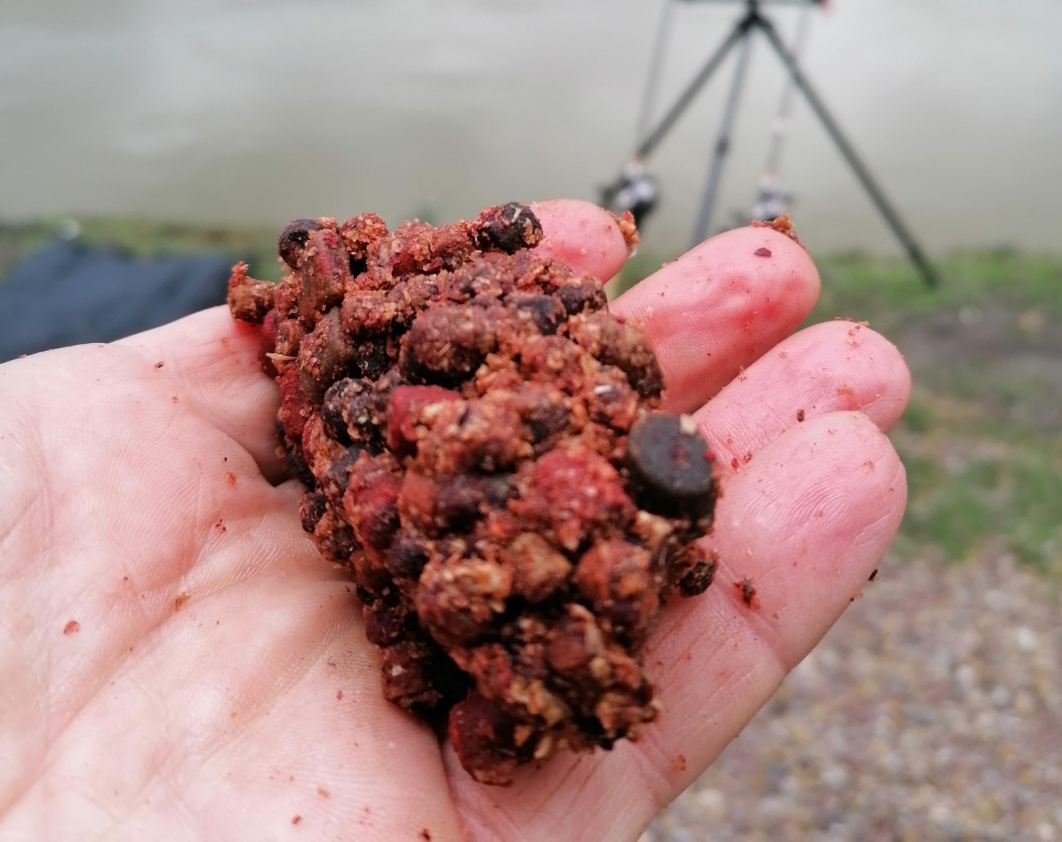With my heavy feeders, I managed to cast and hold in the strong flow feeding a mixture of strongly scented mashed pellet to attract and hold the fish in the heavily coloured water.