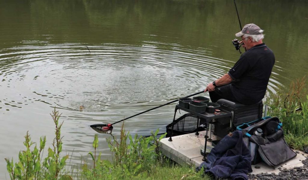 I fed 4mm pellets in front of me and also sprayed casters regularly down to my right, to try and find out what worked best and to see if any different species turned up. It was small stockie carp that responded first to pellets and it was a bite a chuck. As I built the swim up the fish got bigger, providing some great rod-bending action. I could see my mate Jim catching well too.