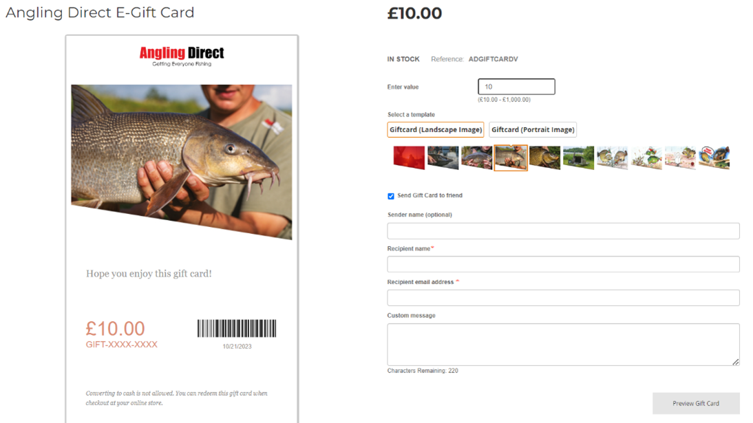 Gift cards are super convenient—no wrapping required! If you're sending a physical gift card, Angling Direct will allow you to have it mail it directly to the recipient's home (or workplace). You could also pick up a gift card from one of our stores! Angling Direct also offer E-Cards which are emailed gift card codes with no physical gift card required saving even more hassle!