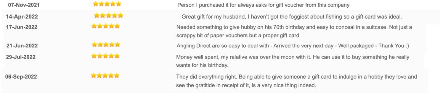 Don’t just take our word for it! Read some of the amazing feedback we have received for the Angling Direct gift cards below!