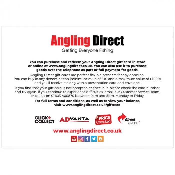 We encourage the purchase of our Angling Direct e-cards as they are perfect for a last-minute Xmas panic and use no plastic or paper waste as it's all electronic! The gift recipient simply used an emailed code that is redeemable instantly when purchasing from Angling Direct online or in-store! You can customise your E-Gift Card too!