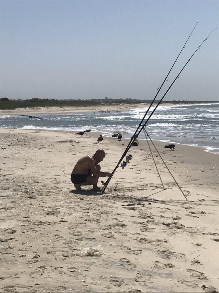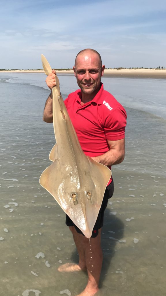 After what seemed like a week we got onto the beach and were off to the spot we wanted to get to in the first place. We got to a point where a river empties into the sea, and where we have had some great sport in the past. Things got off to a good start with Darryn latching into what looked to be a good fish; after a good fight he landed a good guitar fish at about 15+lb s. Shortly after Shaun beached a smaller guitar fish. Things were looking good, but that was the end of the action and after a hour of no action the weed came in and made it unfishable.