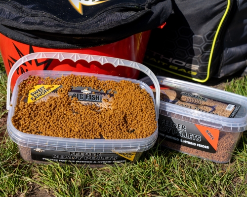 Normally, I’m an out-and-out pellet angler for method feeder fishing, but in shallow water like this with lots of fish, I like to mix in some groundbait. Here, I’m using Dynamite Swim Stim Green. I think the smaller particles help draw in more fish than pellets alone. For pellets, I’m using Dynamite feeder-ready pellets in sweet banoffee flavour, perfect because they need no preparation, you can use them straight from the box. I mix in a few handfuls of groundbait at a time, only mixing a couple of kilos at once so it’s always fresh.