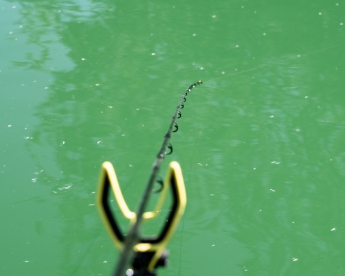 Casting to the far bank, which is only about 20 meters away, I clip up to the spot and once I have cast out I put the rod straight down without putting any bend in the quivertip. This is crucial because I get so many fish in the swim, with the rod tip shaking from tiny knocks and liners almost immediately. If I fished with a tight line and a big bend in the quivertip, the feeder would be dragged off the spot, and the bait wouldn’t present properly around the pile. So, keeping the quivertip straight means the bait stays exactly where you want it and the fish find it more easily. You will know when they are on
