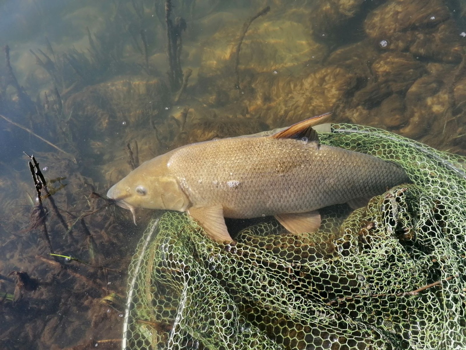 I must admit to feeling a bit nervous as I played what was a decent fish but also an important milestone barbel on 2 counts. I carefully played the hard fighting fish and Peter joined me to slip the net under a decent barbel. Peter did the honours with the camera, and I think he was as pleased as I was.