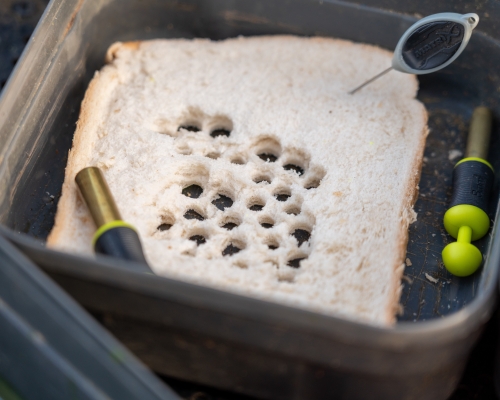 Throughout the session, I dip the bread into Dynamite Baits One Shot F1 Sweet. Underwater footage proved that flavour and colour can significantly reduce bite times. You can absolutely do this with regular bread but it seems that adding that little extra flavour does help. I now favour smaller punches, usually 6mm or even 4mm, especially when F1s are present. Smaller bread is easier for them to take cleanly and results in better hook-ups.