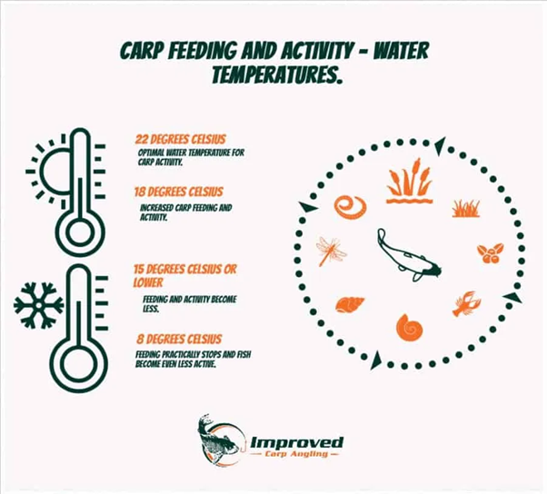 Water Temperature: Water temperature can be a huge factor in the feeding habits of carp, optimum water temperatures for feeding carp are as follows: 22 Degrees Celsius – Optimum Water Temperature for Carp Activity., 18 Degrees Celsius – Increased Feeding and Activity., 15 Degrees Celsius (or lower) – Feeding and Activity Become Less.,8 Degrees Celsius – Feeding Practically Stops and Fish Become Even Less Active.