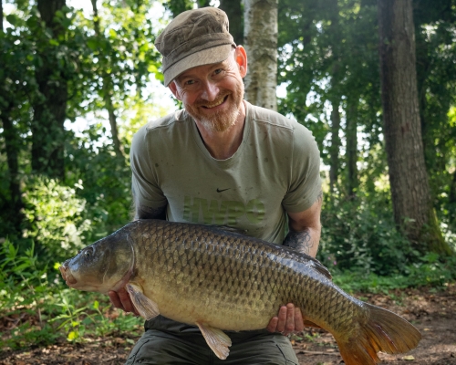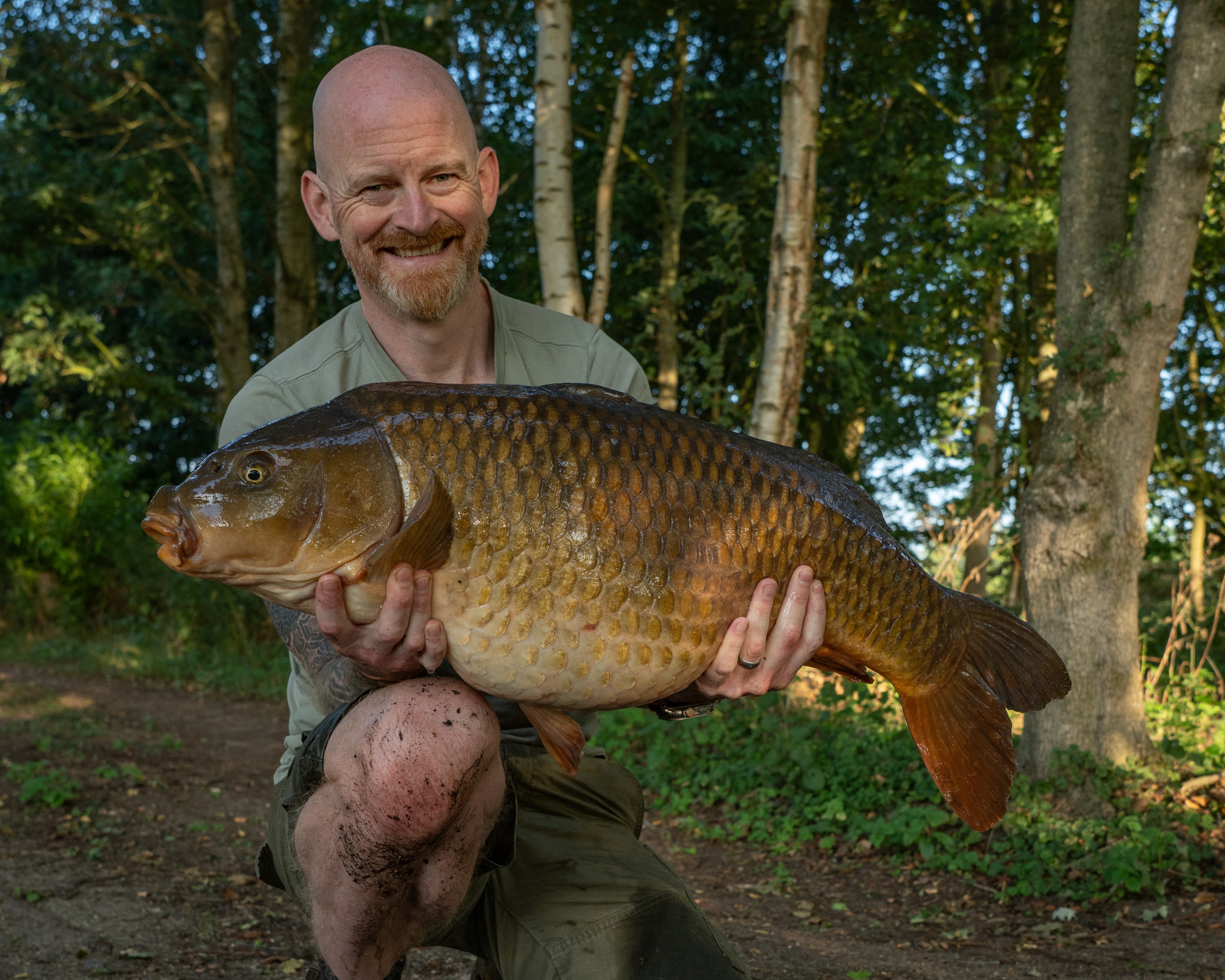 The session couldn't have started better. Right as I started putting Craig on the spot to introduce himself and his fishing background for the camera, he hooked into a fish on his first cast in two years. Muscle memroy kicked in and after a perfectly timed strike, he was in! The result was a cracking common just over 20lb, and the grin on his face said it all.