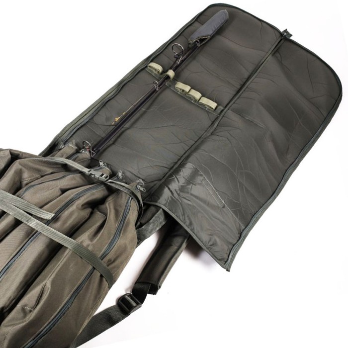 This rod holdall is designed to carry much more than you would expect whilst still providing exceptional padded protection for six fully made up rods. This very best seller has been advanced and adapted over the years to cater for the ever changing trends in tackle design. Fully padded, zipped flap provides total protection and ease of access. Internal Velcro pocket for rod bands, leads etc. Fixed, individual zipped pouches with Velcro ties above to secure rods. Will cater rod rods up to 13ft in length. Padded pouches to accommodate all sizes of reels. Integral line guards above the reels eliminate any chance of lines being trapped in zip. New extended main body, double zipped and gusseted, will accept most shelters. Large exterior zipped pocket houses two reinforced interior pockets for landing net, bank sticks, rod pods and throwing sticks etc. External spine pocket for landing net pole. Up-dated comfortable, balanced carrying system. Conveniently folds for bivvy storage. A perfect partner for the Savay barrow bag.