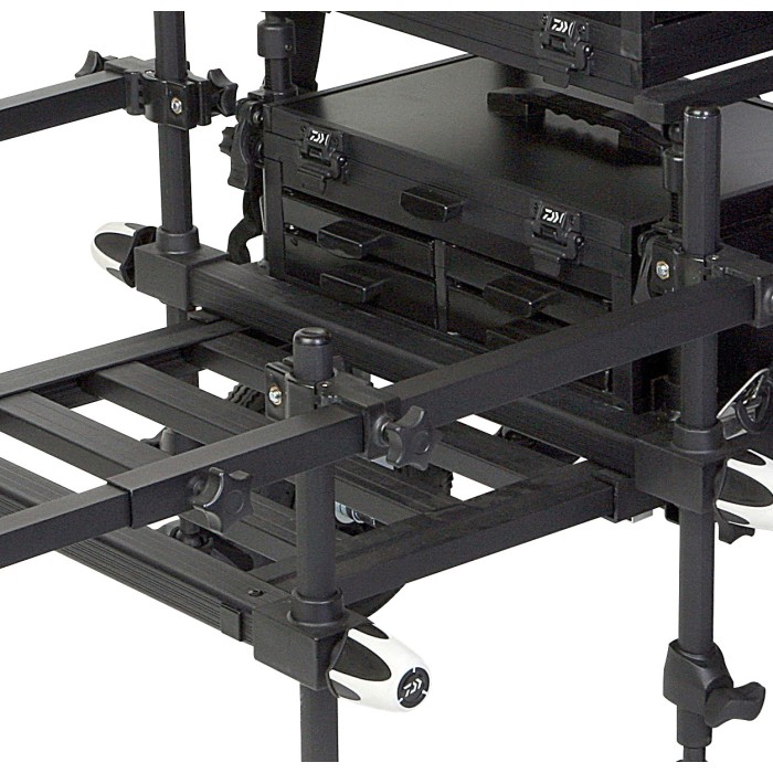 Designed with a built in height adjustable top compartment you are able to tailor the leg clearance to suit your needs. An integrated foot plate and four telescopic legs with mud feet (+2 standard) ensure it will handle any terrain. Also housed in the top compartments are two large side drawers and two shallow trays.