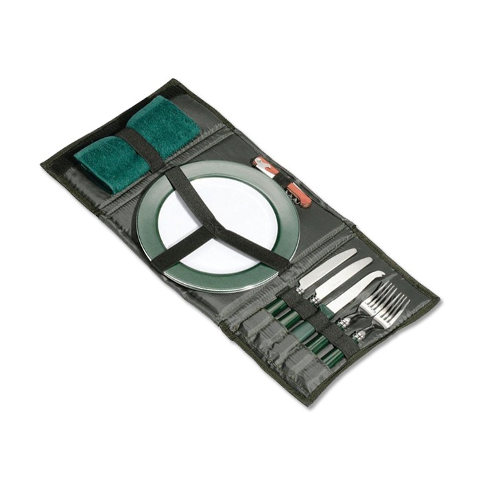 Daiwa Infinity Dinner Set contains: Two dinner plates, Two knives, Two forks, One accessory knife, One Multi-Purpose Tool (Bottle Opener, Cork Screw and Pen Knife), and 1 x Hand Towel Dimensions 27cm x 25cm x 3cm.