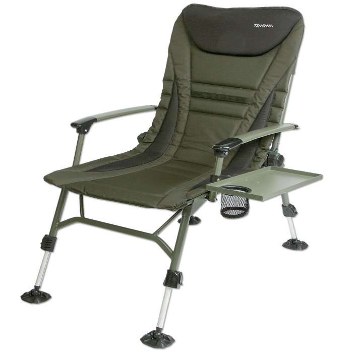 The multi point recliner feature and arm rests ensure comfort and support for short stay session and location behind the rods. Multi terrain is also easily handled thanks to the four camlock telescopic legs with mud feet. The side tray also features an adjustable attachment that allows for levelling and placement on either side.