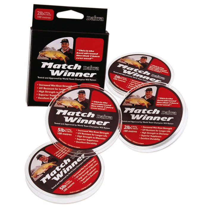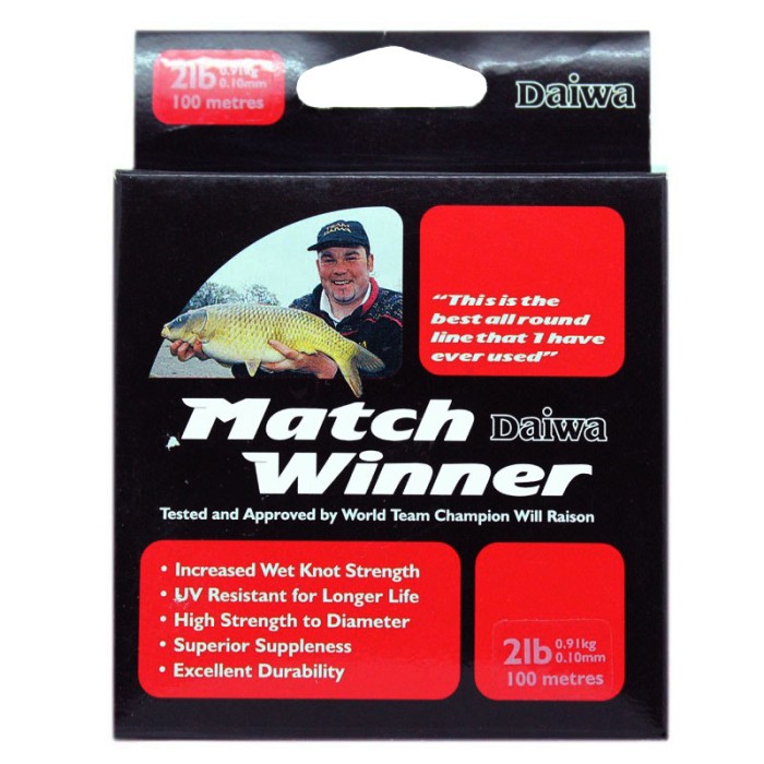 Daiwa Match Winner Monofil, Tested in close consultation with Will Raison and primarily suited to the rod and reel, Match Winner is highly versatile and has many features including an incredible level of durability. With a high strength to diameter ratio and up to a 30% better wet knot strength. Supplied on 100m spools.