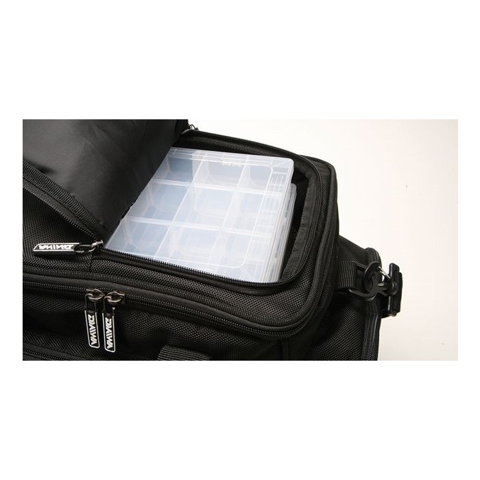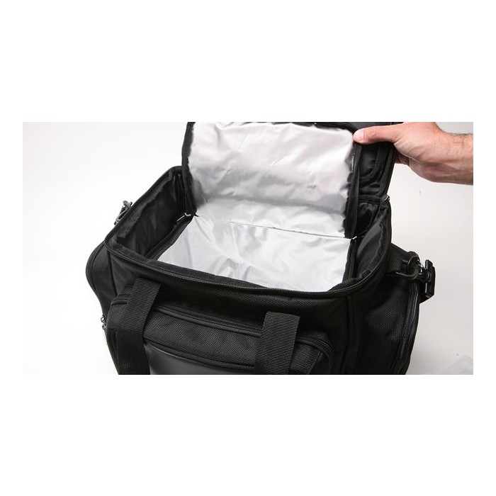 A multi layered main compartment with high tech foil and foam. Includes two tackle boxes (dimensions 27cm x 18cm x 4cm). The dimensions of the main compartment are30cm x 25cm x 30cm. With its reinforced material on the base for extra protection, three external pockets, padded adjustable shoulder strap, carry handle and two way zips it truly is a versatile multi funtional carryall.